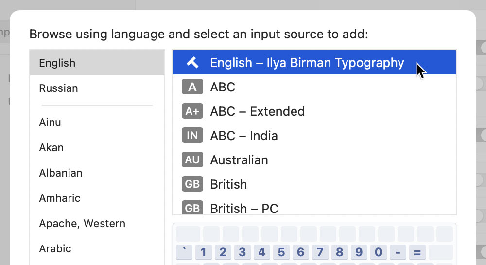 - Выберите русский язык, нажмите «Параметры». Добавьте типографскую раскладку, удалите стандартную. Повторите для английского языка.